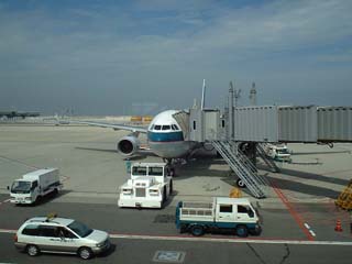 | ついに飛行機に乗る時がやってきました。 ハッキリ言って、時期が時期だけに、恐らく 影響が無いとは思われてもやはり緊張します。 (2日前より米軍のアフガン爆撃が始まったので) とりあえず今回命を預ける旅客機です → 幽霊ネットサーファーになれるかどうかが かかってました。(笑) |