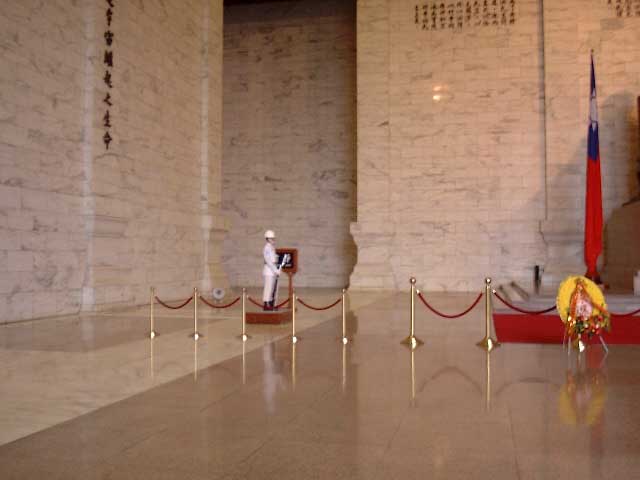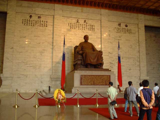 上の写真から建物を見た右側にかなり巨大な両開きの 引き戸があり、昼間は開放されてます。夜は閉まって いるかどうかは知りまへん。 蒋介石さんの像です。結構でかいっす。 でも笑顔だったりします。 |