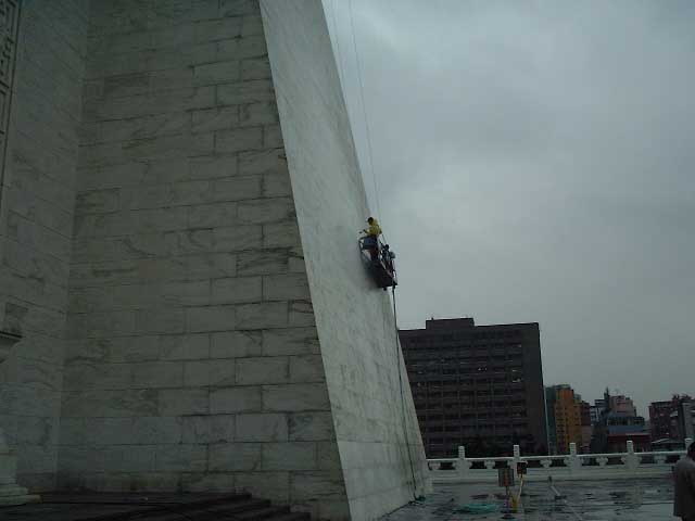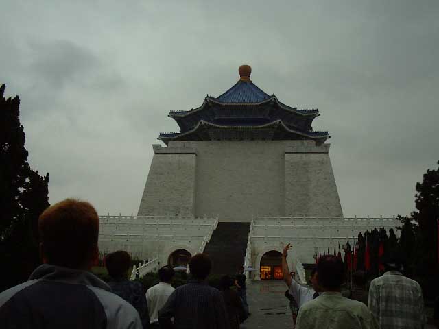 中正記念堂というところに。 蒋介石さんの偉業を称えて作られたそうで。 ガイドさん曰く、「壁は全部大理石で出来てます」と。 実は、恐らく大理石で出来たパネルが貼ってあると 思われ。ま、かなりでかい建物なんで、そうしないと 逆にヤバイようにも思われ。 ← 天気悪いんで写真が暗いっす。 |
